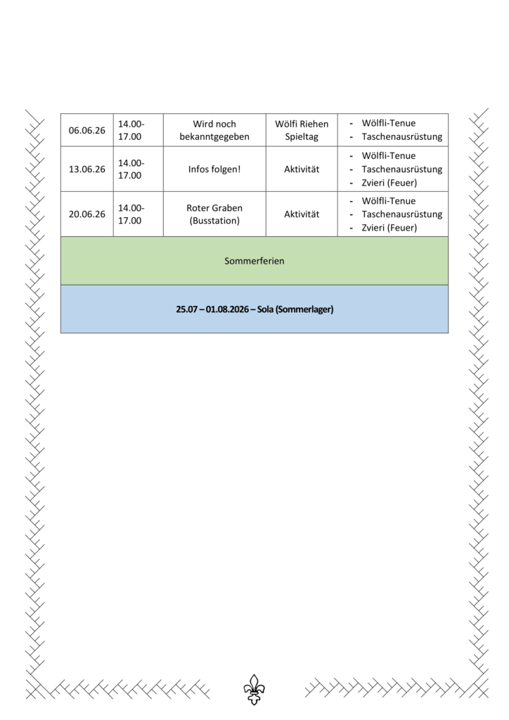 Bei den Wölfen gibt es meistens jedes Jahr ein einwöchiges Sommerlager (SoLa), sowie ein Niggi-Näggi-Weekend zusammen mit den Pfadis und ein Technik-Weekend. Ausserdem kommt es manchmal zu besonderen Weekends wie zum Beispiel die Hobelsafari, welche ein bezirksweites Weekend aller Wölflis aus Basel, Rheinfelden und Möhlin ist.